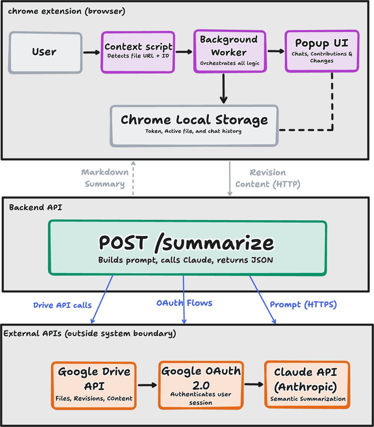 The frontend extension runs within the Chrome browser context and is responsible for all user-facing interactions: document detection, revision browsing, per-author contribution display, and chat-based querying. It communicates exclusively with a local backend server running at http://localhost:3000, which manages the resource-intensive operations of content retrieval from Google Drive and AI-powered semantic analysis via the Claude API. This hybrid architecture was chosen for two primary reasons. First, it keeps all authentication tokens, OAuth credentials, and chat history on the user’s machine, ensuring that no sensitive data is transmitted to or stored on a third-party server. Second, it offloads computationally expensive API orchestration, including pagination through revision histories and prompt construction for Claude, to a process running outside the browser’s sandboxed extension context, which has stricter resource and network constraints.